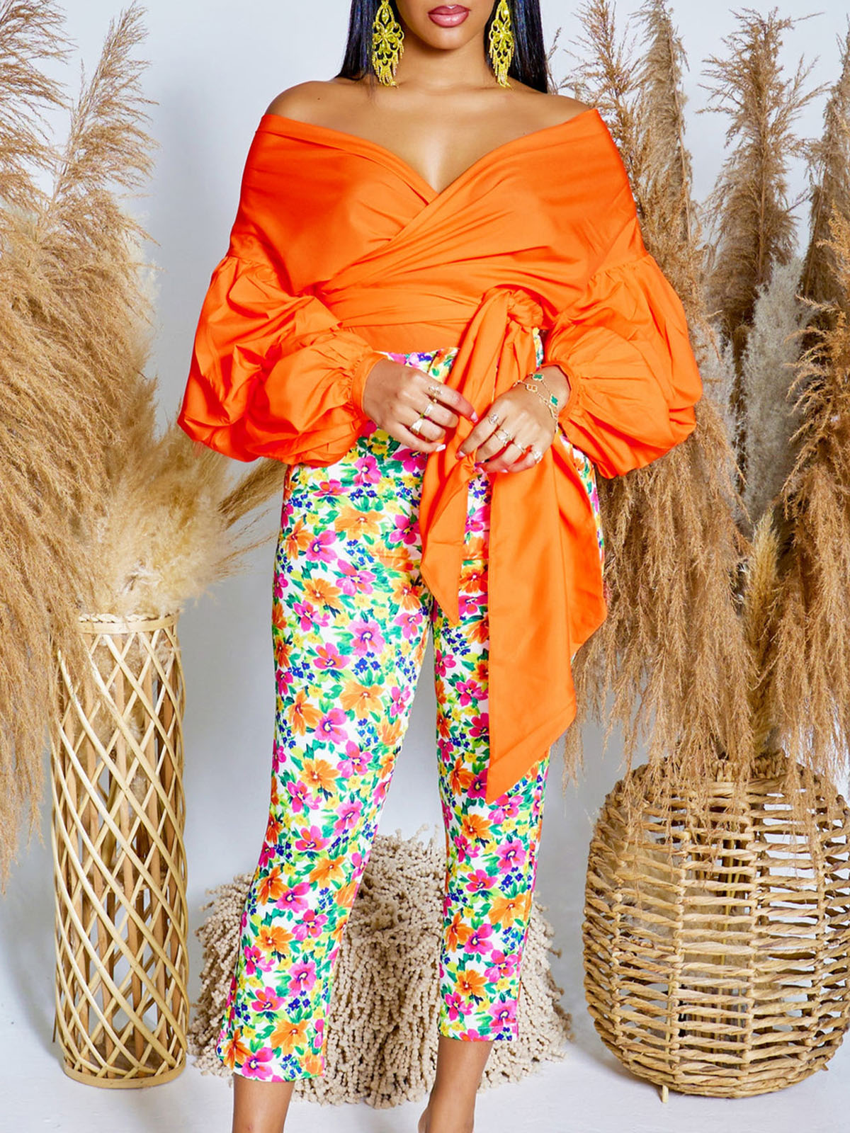 Off-Shoulder Puff Sleeve V-Neck Blouse