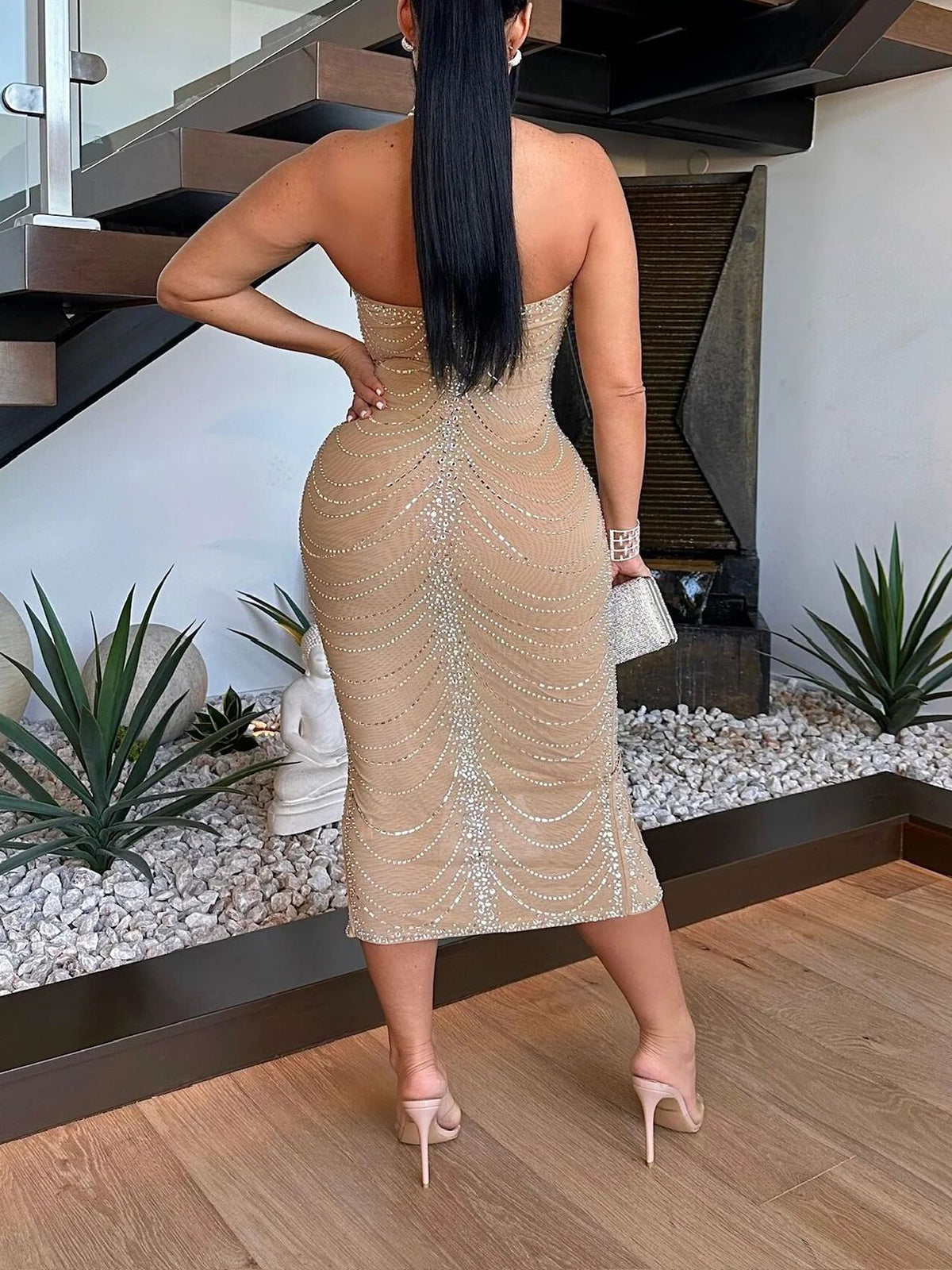 Rhinestone Halter Neck Mesh Dress