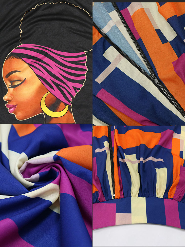 Features: Two-piece outfits, short sleeves, figure print, crop top, high waist, zipper, geometric pattern, high split, floor-length, maxi skirt.