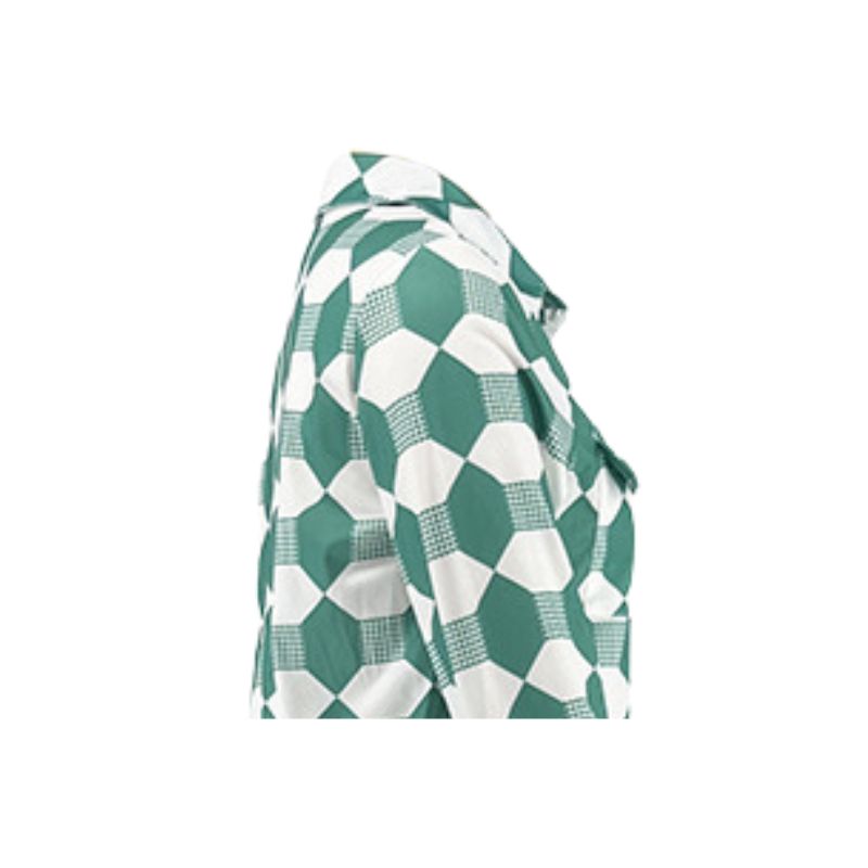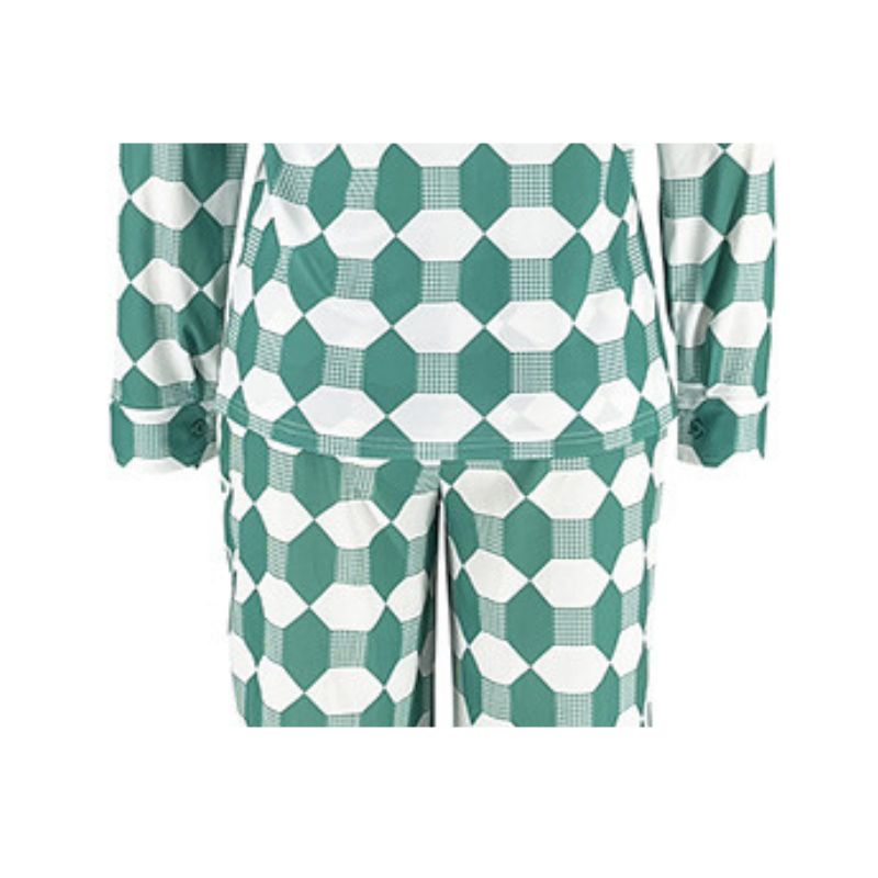 Features:Set, pants, shirts, long sleeves,long pants, lapel, wide leg, zipper front, high waist, color contrast, geometric printed design, pocket patch, loose.