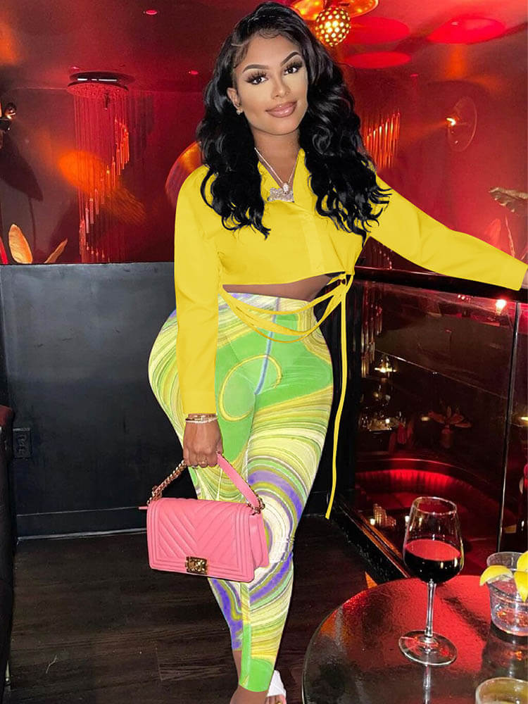 Features:Solid color, button down, crop top, bodycon, floral print, see-through, long pants.