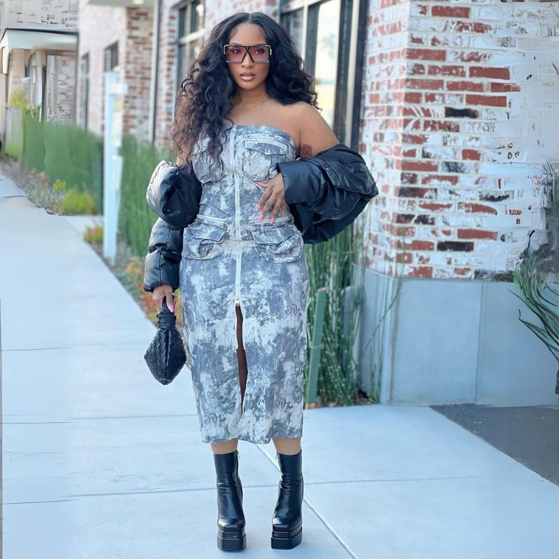 Features:Dress, strapless, zipper, graffiti design, pocket patch, sleeveless, color contrast, bodycon, midi dress.