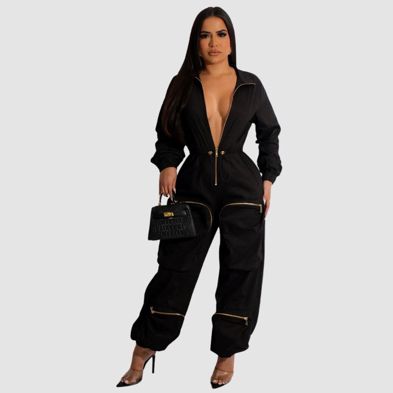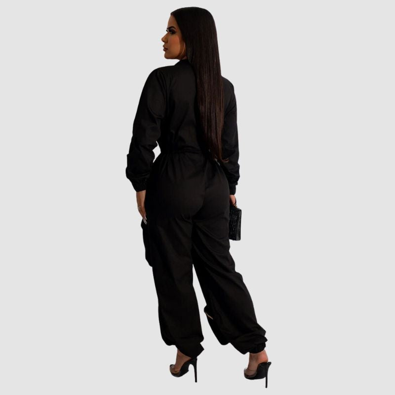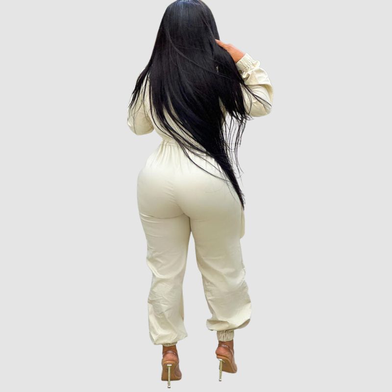Features:Jumpsuits, pants, cargo pants, relaxed fit, drawstring waist, high waist, zipper front, lapel, patch pocket, solid color, long sleeves, oversized.