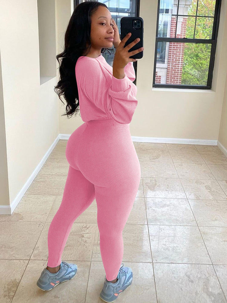 Feature: Solid color, ribbed knit tops, and skinny pants.