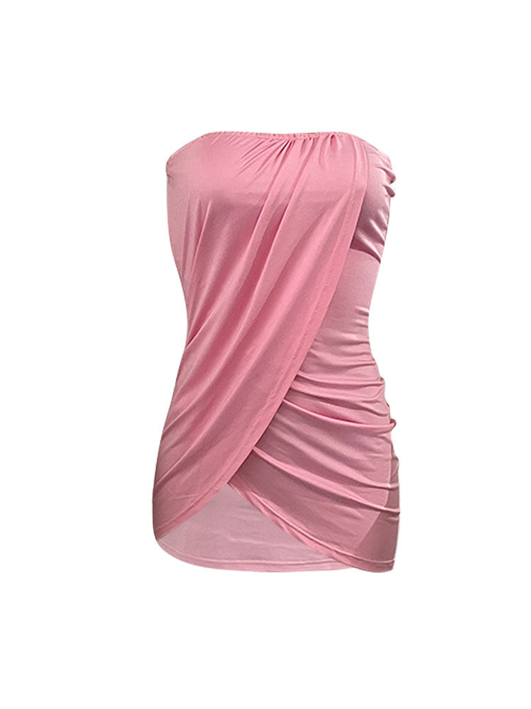 Features: Sleeveless, off-shoulder, solid color, ruched, side split, bodycon mini dress.
