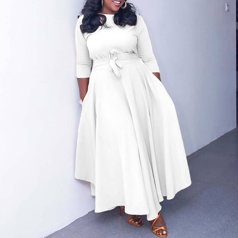 Features:Dress, crew neck, cinched waist, high waist, three-quarter sleeves, side pocket, solid color, tie-up, loose.