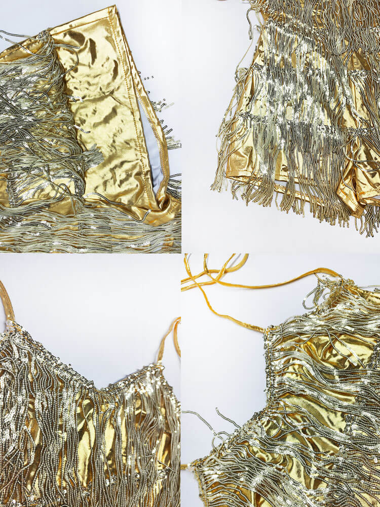 Feature: Sequin, glitter, halter neck, tassel, sleeveless, backless, solid color, tie up, bodycon, short jumpsuit, rompers.