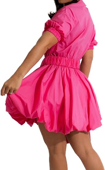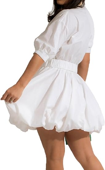 Design features include a front button fastening, high waist, long sleeves, knee-length and puffy hem, all in a solid color.