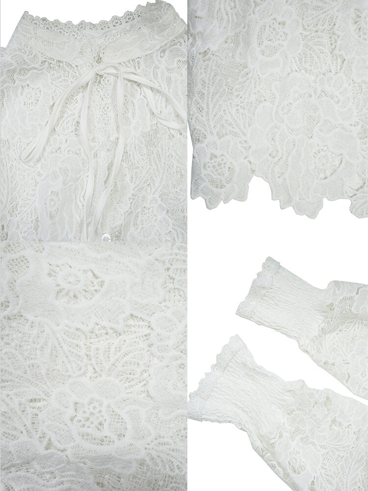 Feature: Lace, floral print, lantern sleeve, long sleeve, solid color, tie up, hollow out, ruffle, see-through, shirt, tops.