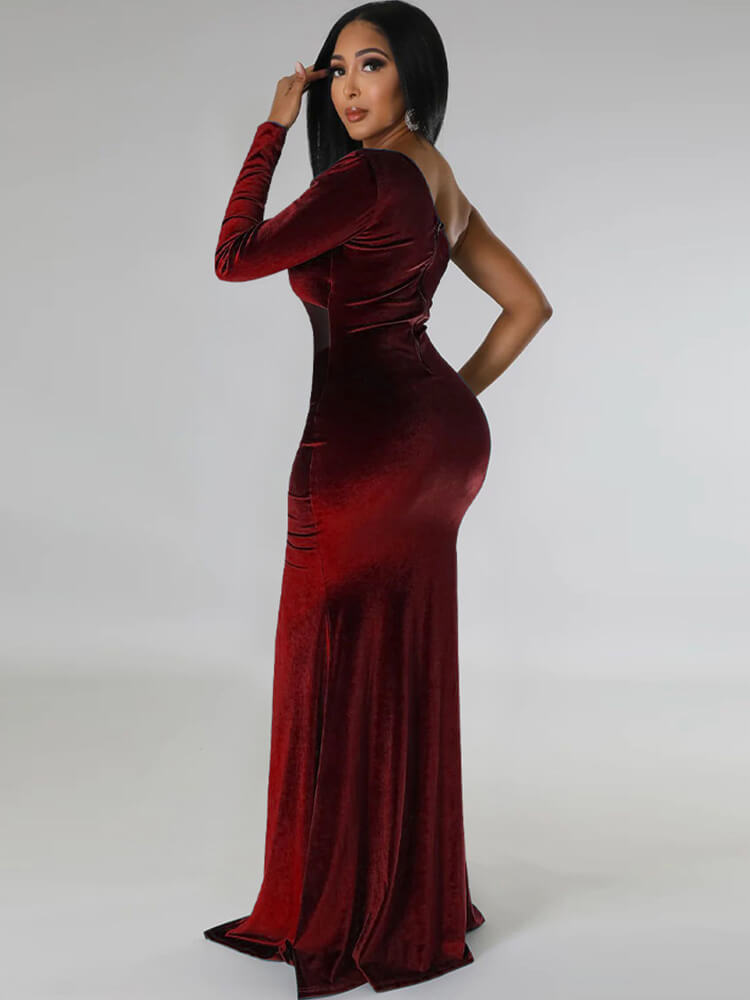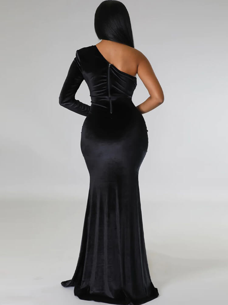 Feature: Mesh, long sleeve, one shoulder, bodycon, ruched, patchwork, solid color, sexy, split, maxi dresses.