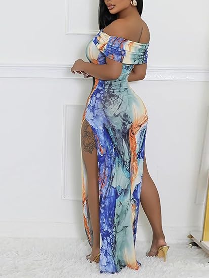 Off Shoulder Print Sleeveless Side Slits Maxi Dress
