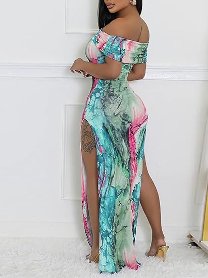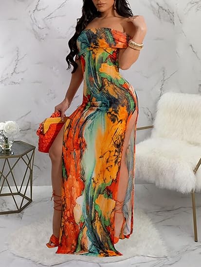 Designed with a strapless neckline, vibrant tie-dye print, and high slits on both sides, this dress exudes a summer tropical vibe.