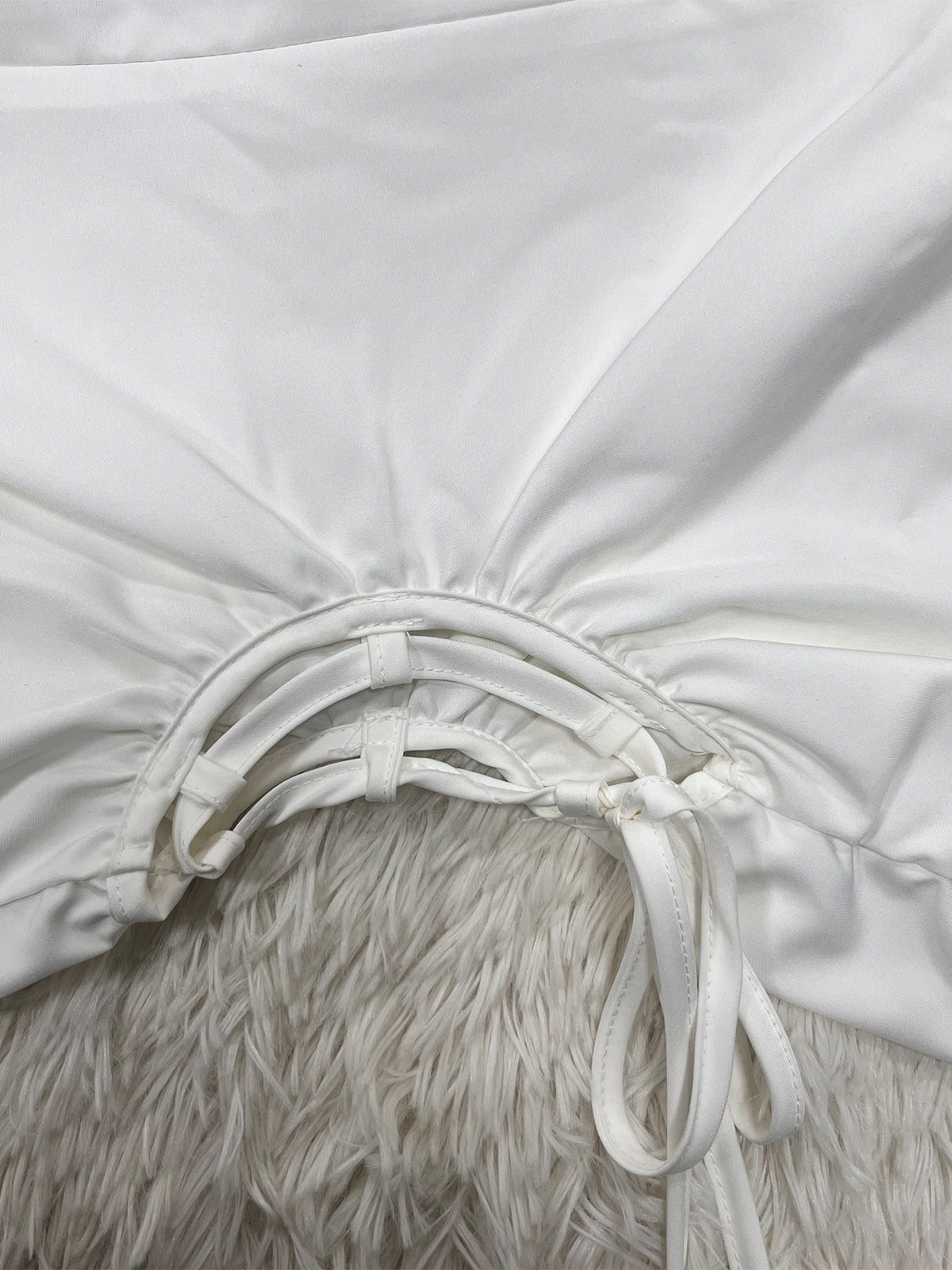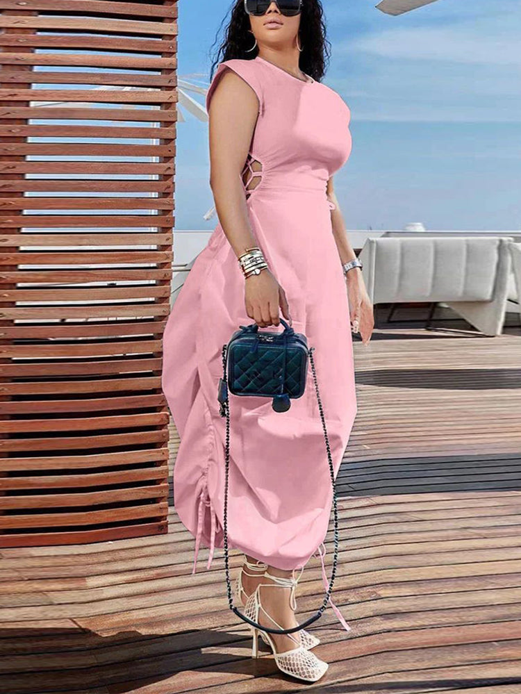 Solid Color Puff Sleeve Drawstring Waist Dress