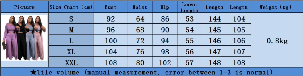Features:Set, pants, crop top, coat, camisole,long sleeve,long pants, drawstring waist, high waist, solid color, bodycon, straight leg, three pieces.