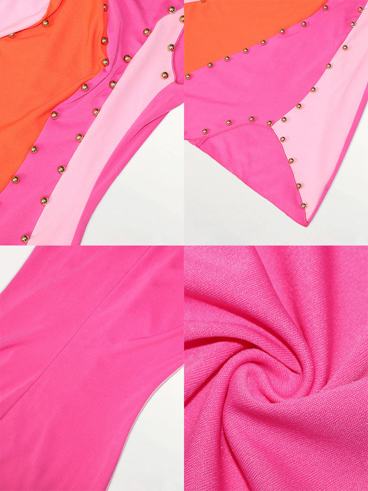 Features: Sleeveless, color block, patchwork, beads, asymmetrical hem, bodycon mini dress.