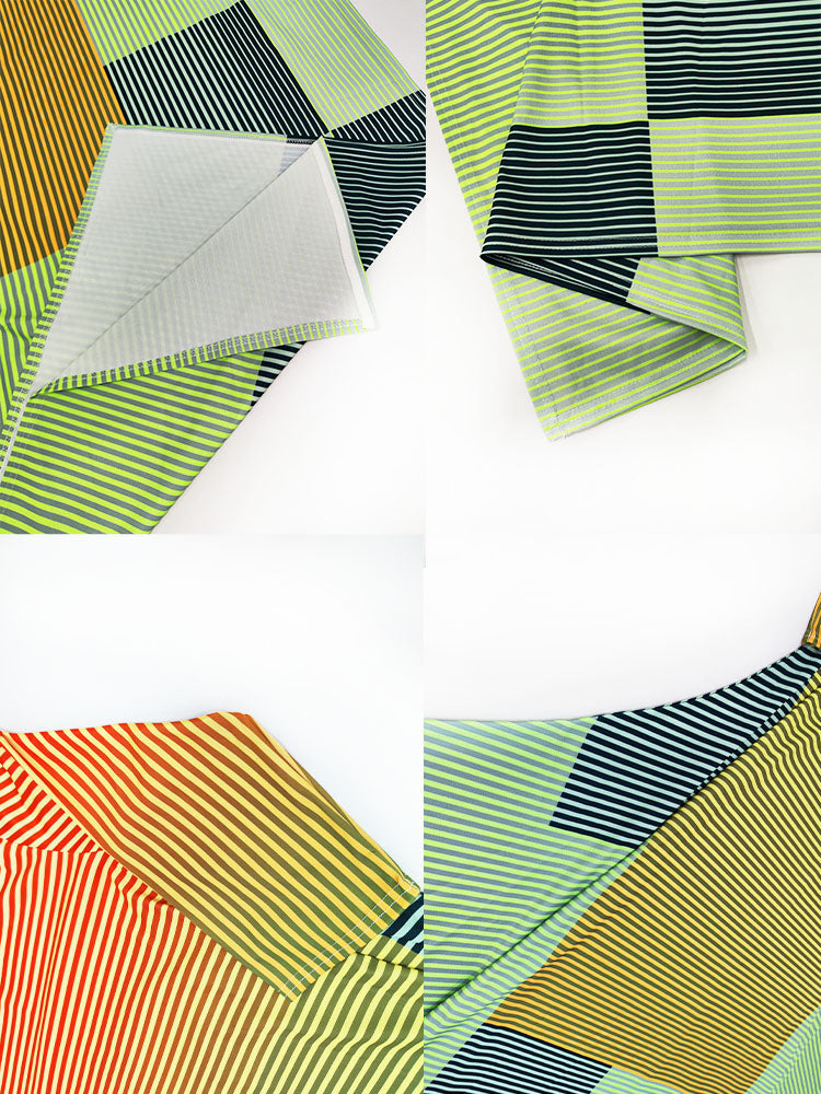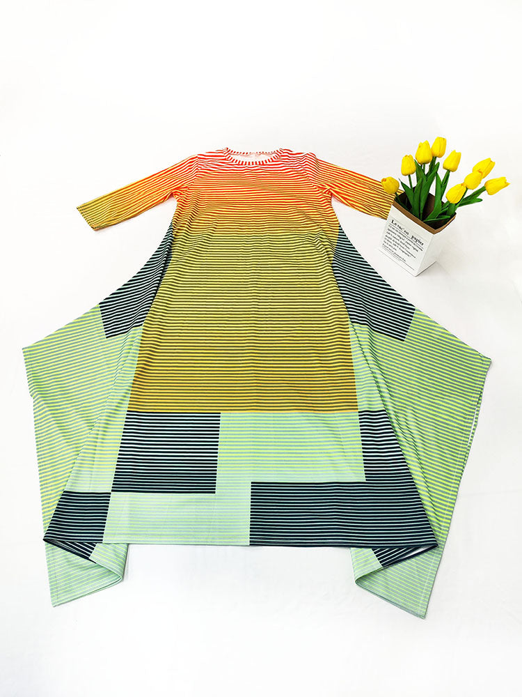 Features:Long sleeves, striped print, asymmetrical hem, loose, midi dress.