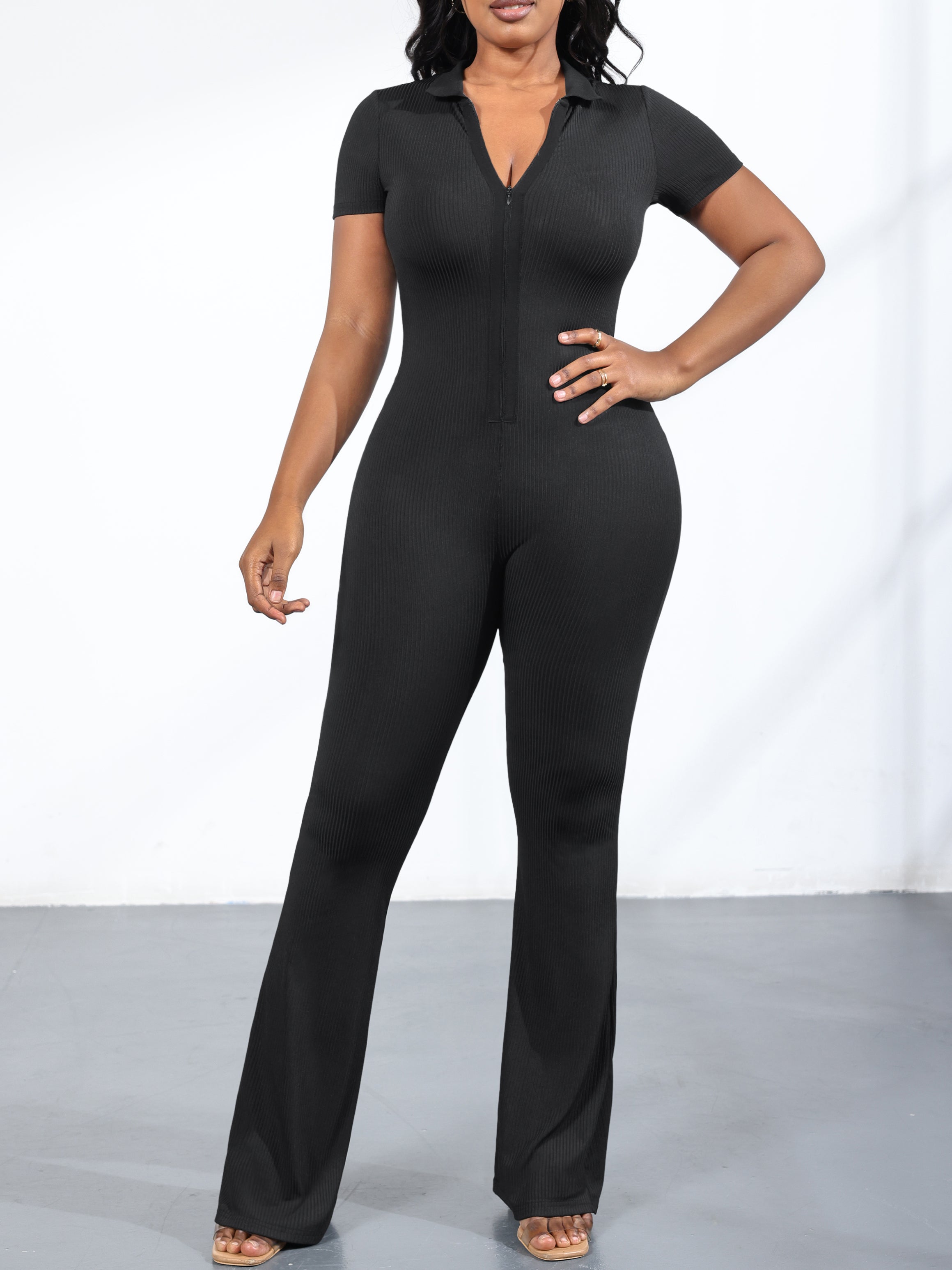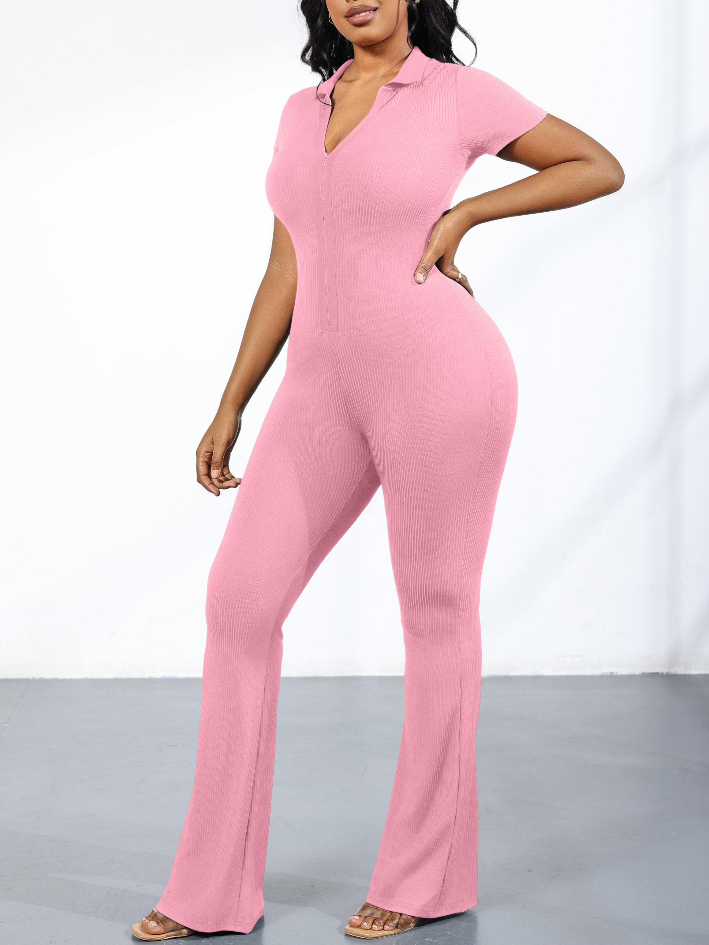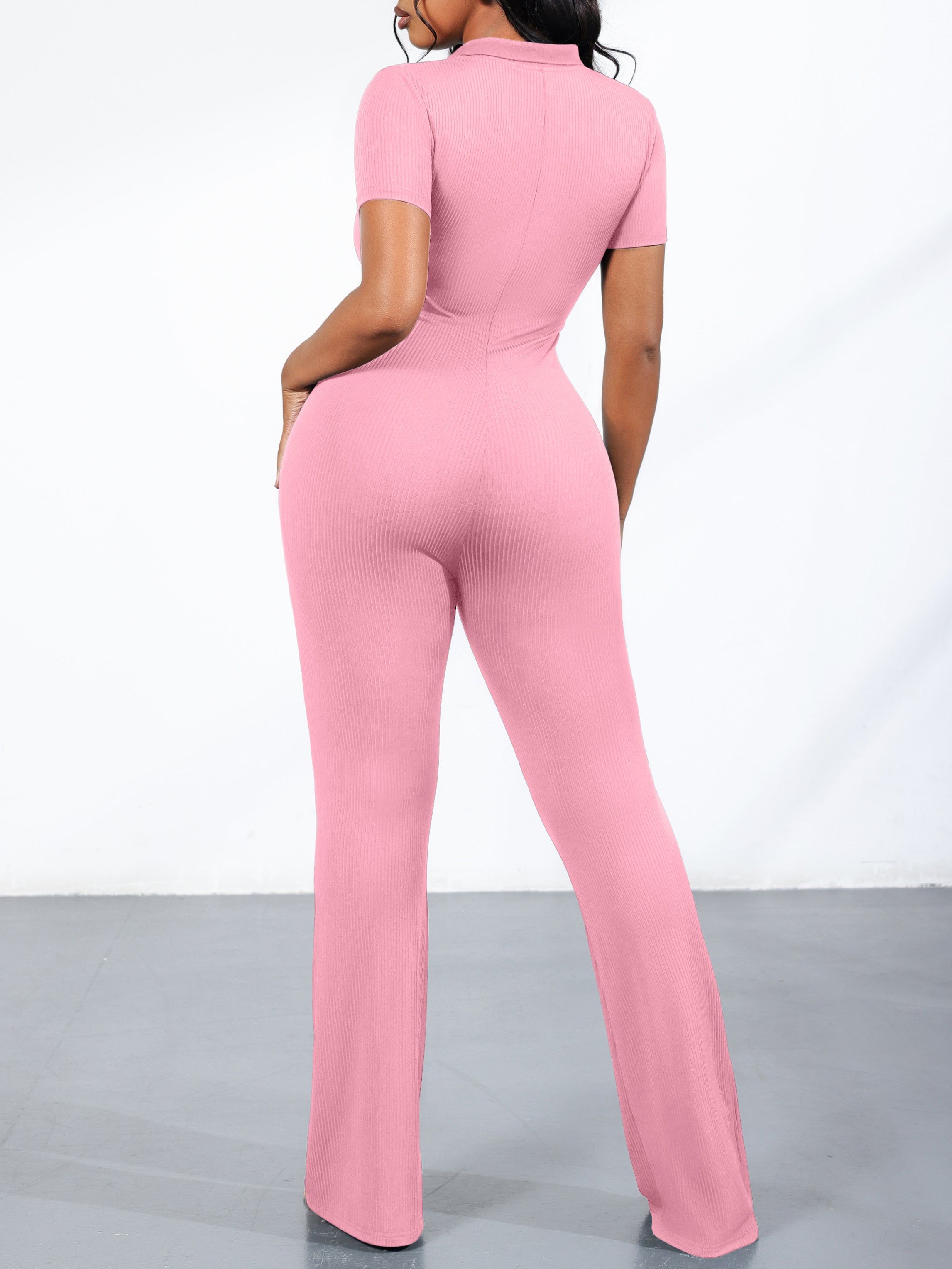 Ribbed Knit Zipper Solid Color Jumpsuit