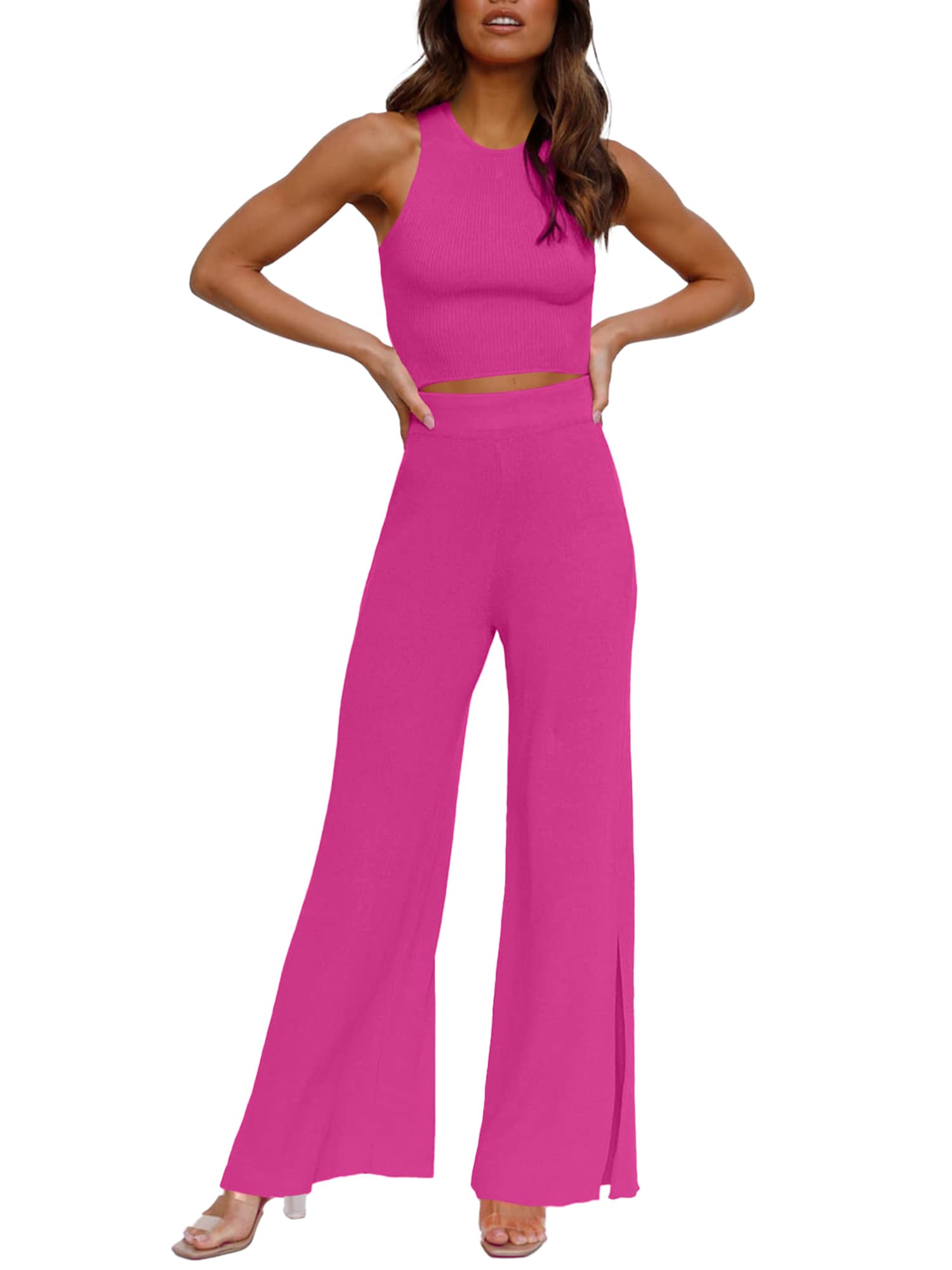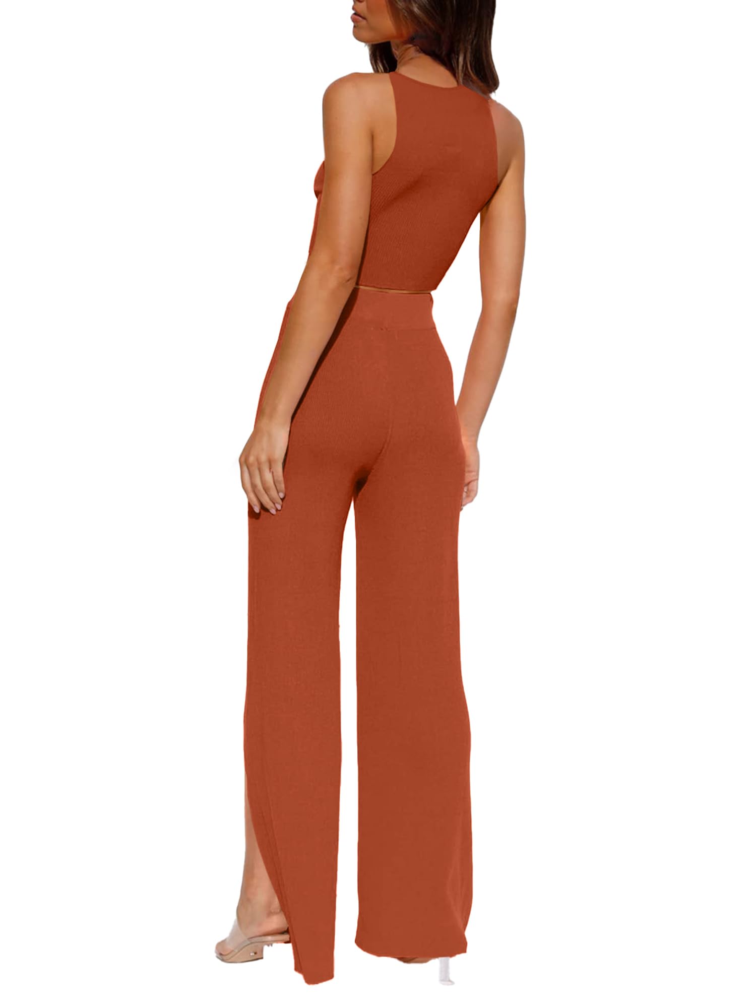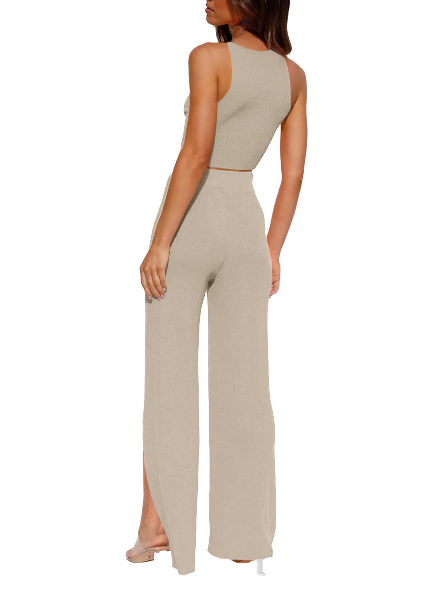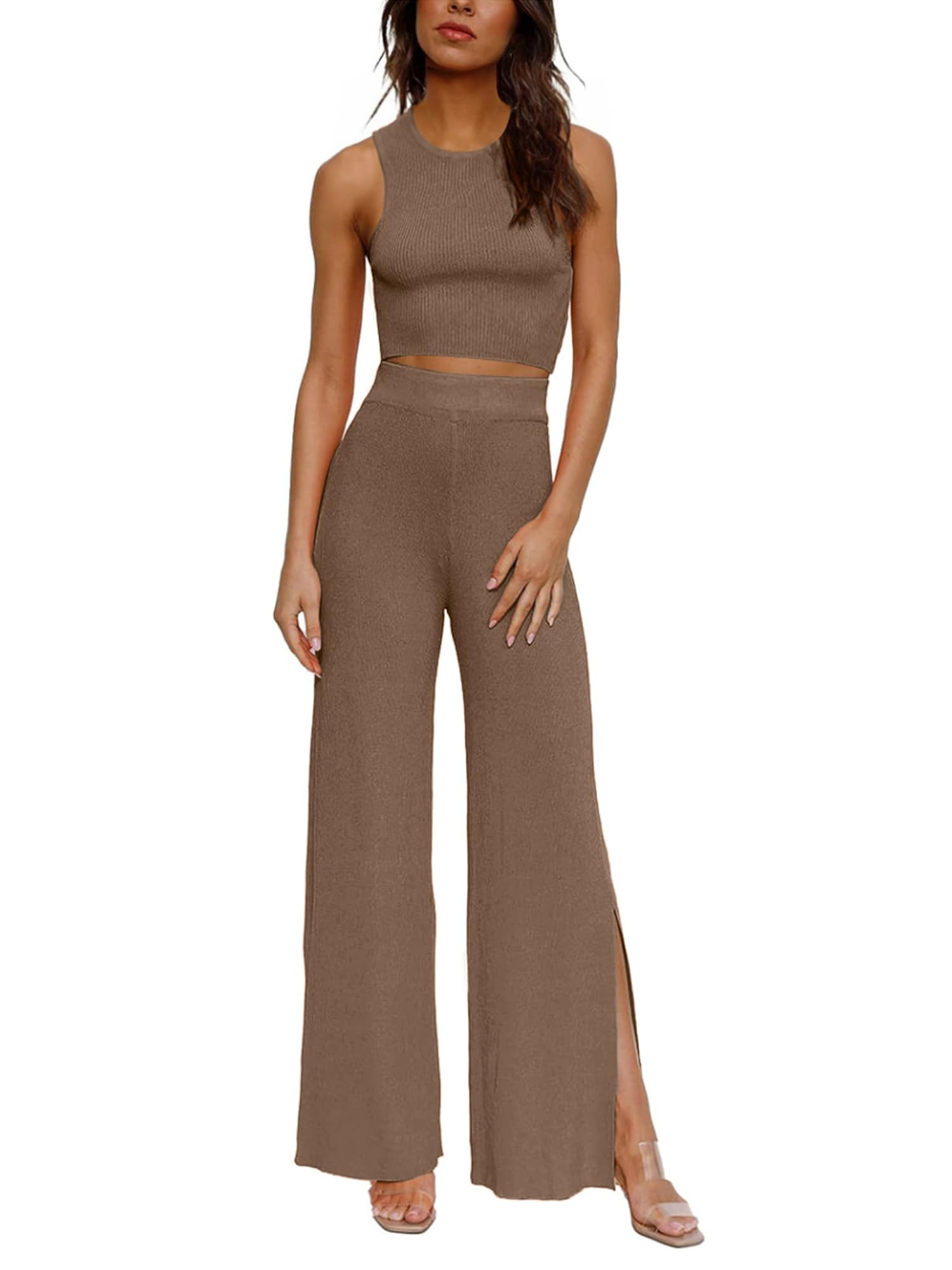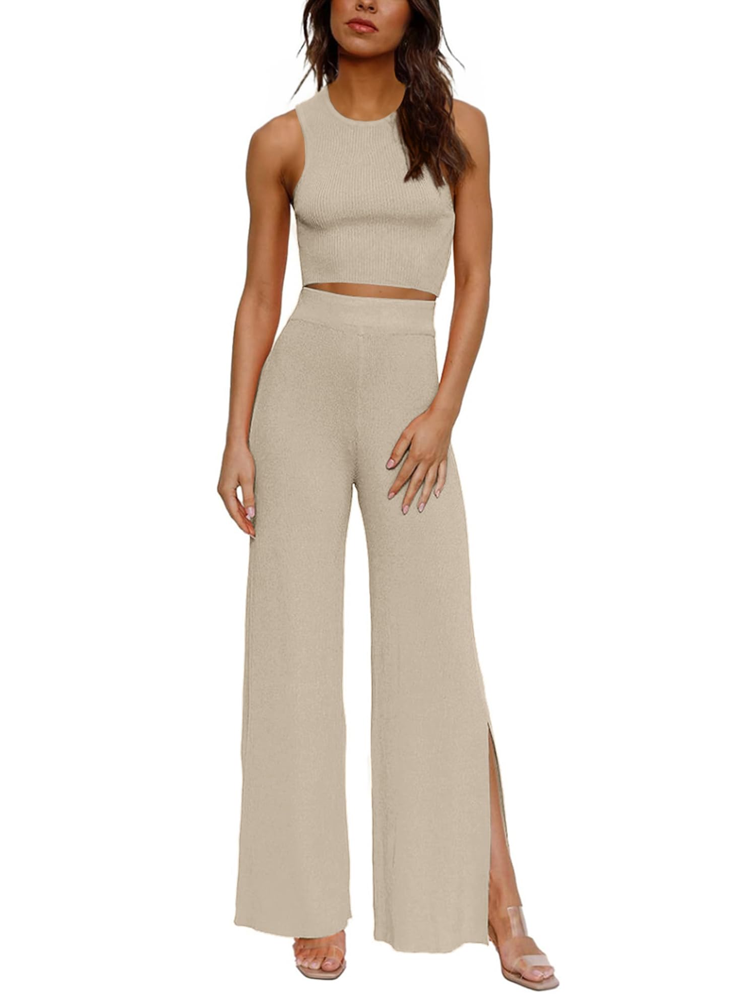 Feature: Cropped tank top and wide-leg pants with side slits. This knitted casual set is stylish and elegant. The breathable fabric is comfortable and skin-friendly, making it an indispensable fashion item in your wardrobe.