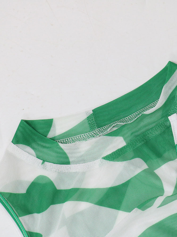 Irregular Print Mesh Maxi Dress with Bikini Set