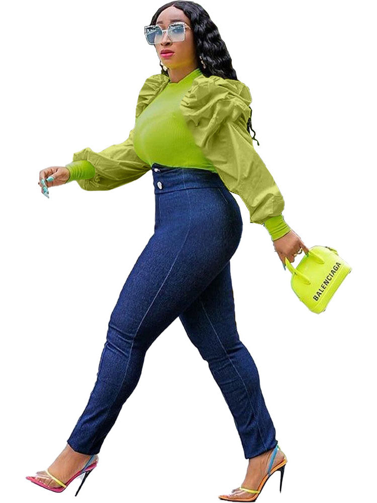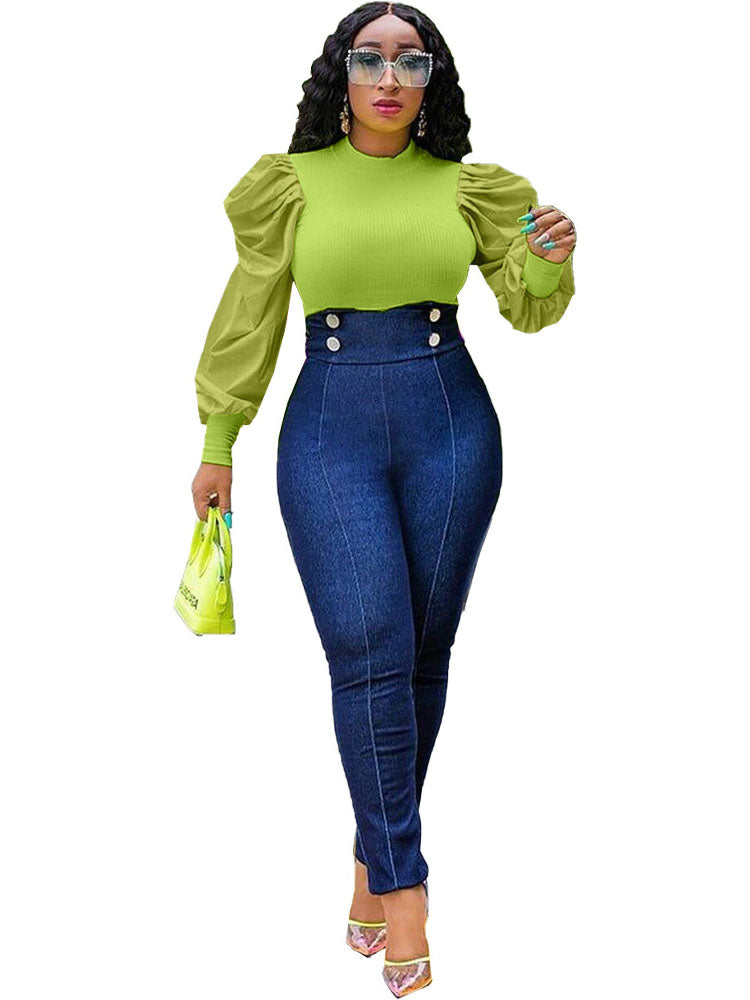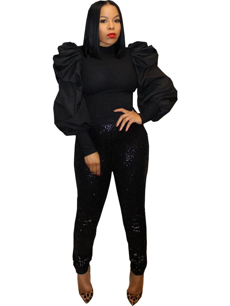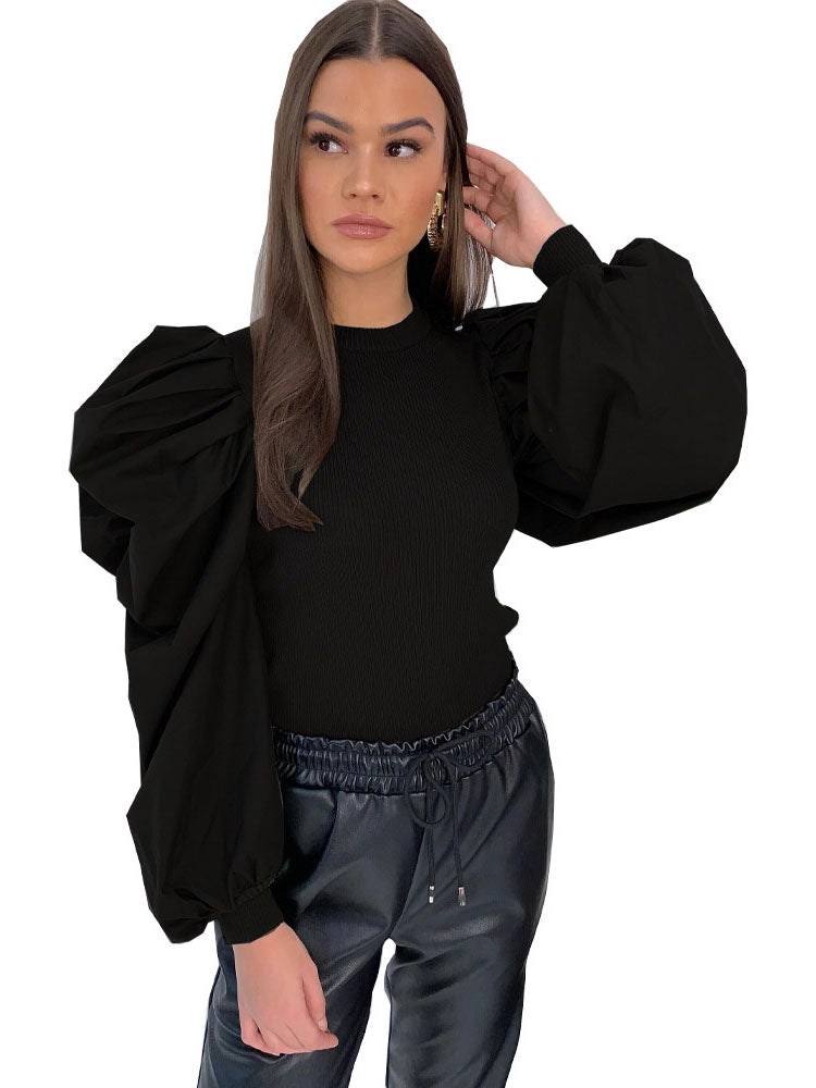 Features:Puff long sleeve, color block, crew neck, patchwork, knit, tops.