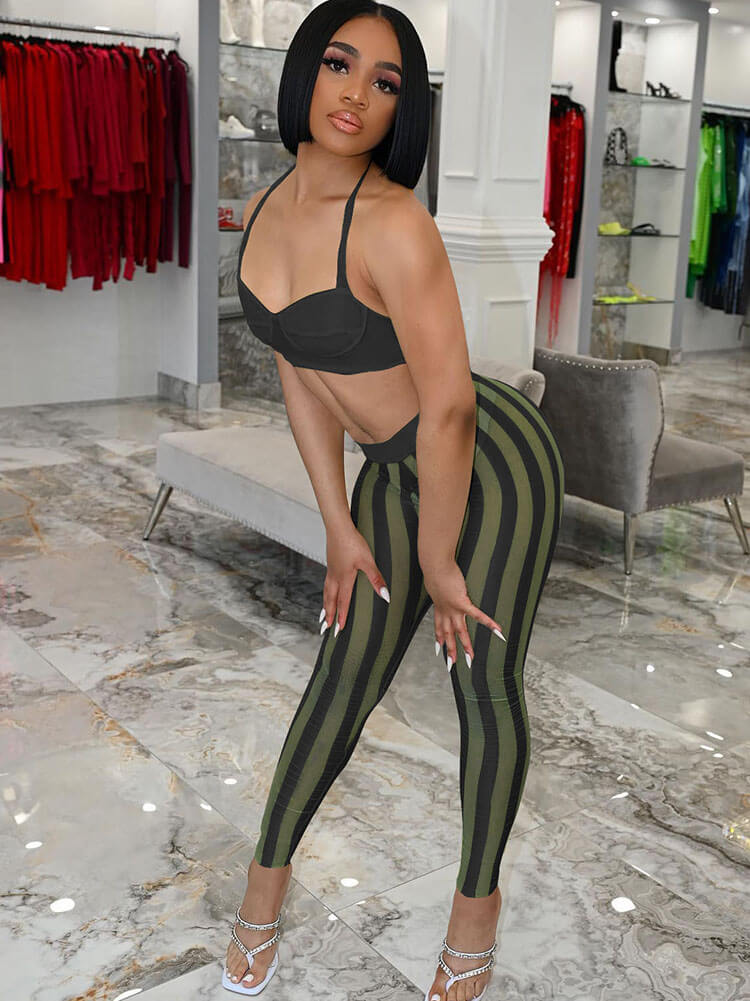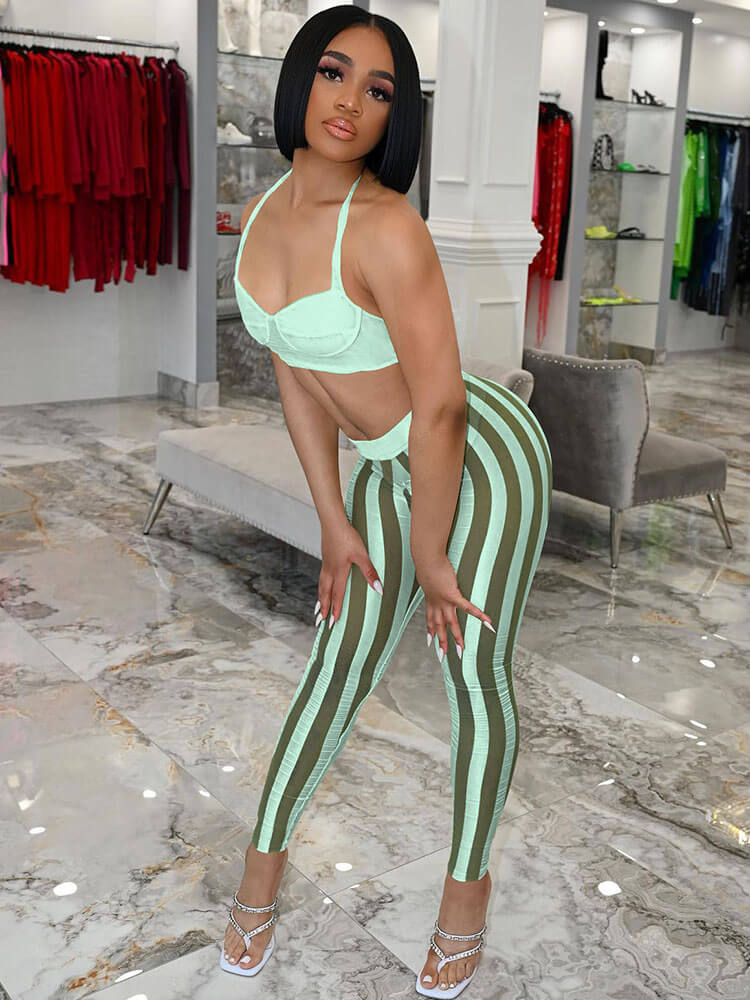 Feature: Two-piece outfits, sleeveless, halter, lace-up, v neck, backless, solid color, crop top, high waist, sheer mesh patchwork, striped, bodycon long pants.