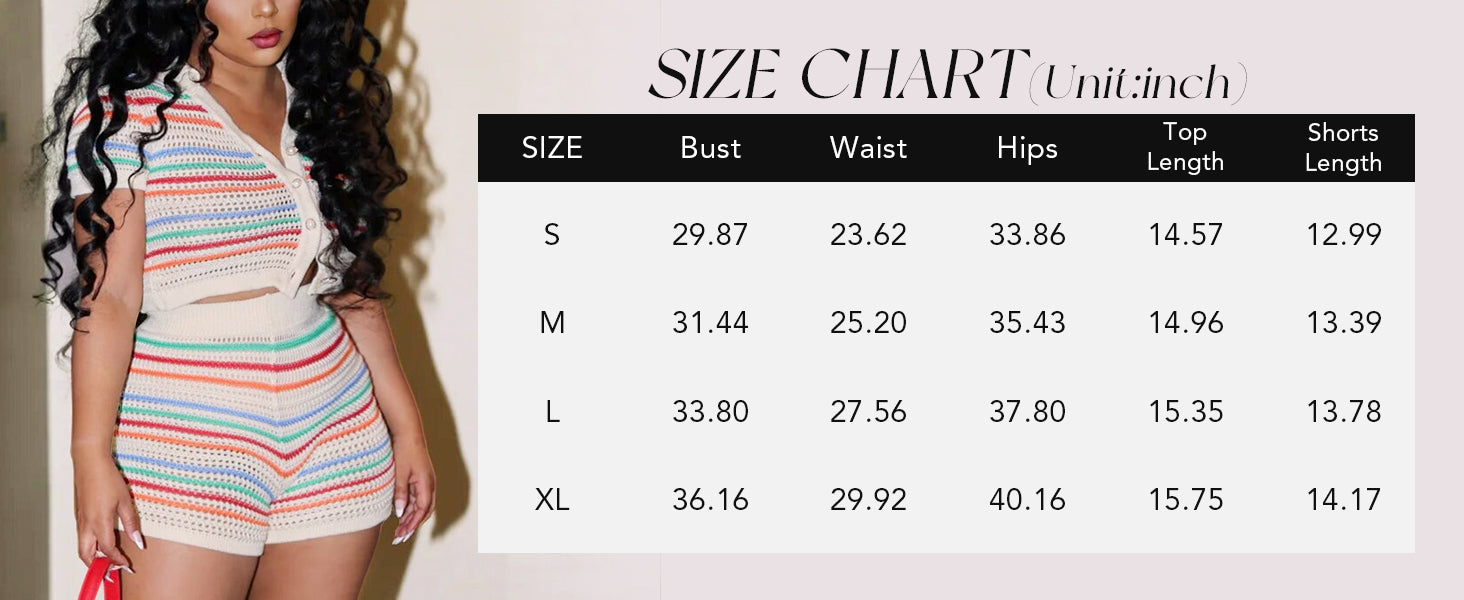 It features a short-sleeve crochet top with button closure and slim-fit shorts with an elastic waistband, giving it a relaxed and laid-back look.