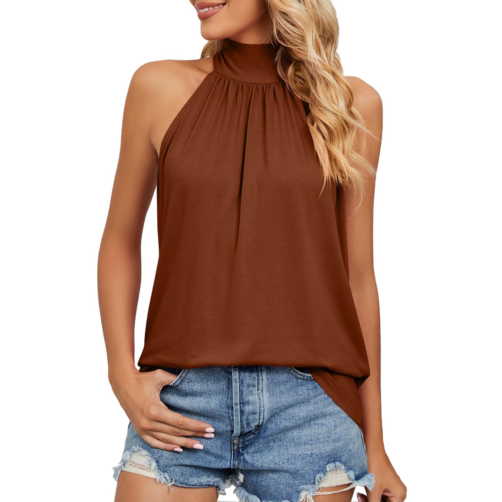 This sleeveless mock neck halter top for women offers a stylish and versatile option with its solid color, off shoulder design, and bow tie. The hanging neck accentuates the shoulders, creating a slim and chic look.