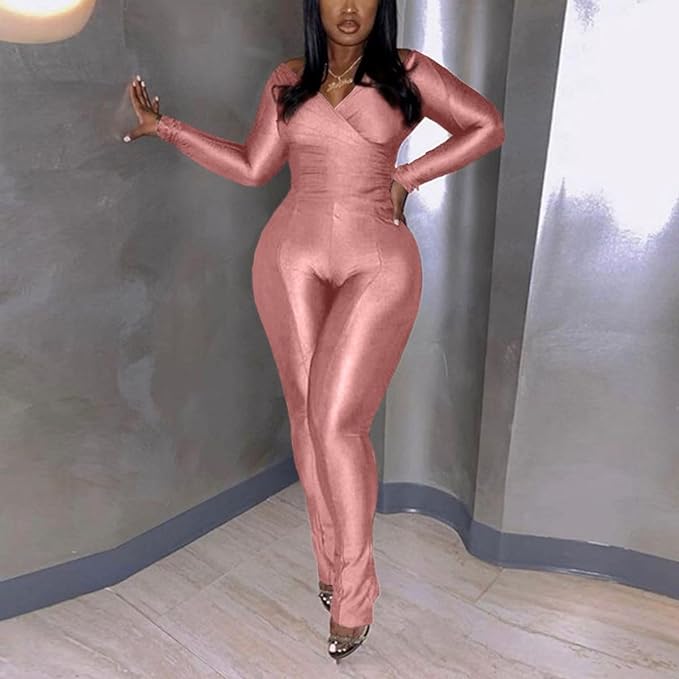 This sexy going-out set features an off-shoulder design, long sleeves, ruched tops, and a deep v-neck. The high-waist skinny leggings and flared pants add a touch of style and are designed to provide a slim and flattering fit.
