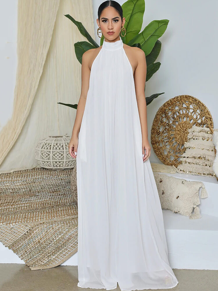 Features:Pull-on closure, halter neck, sleeveless, backless, wide-leg with pocket, A Little Through, elegant and casual.