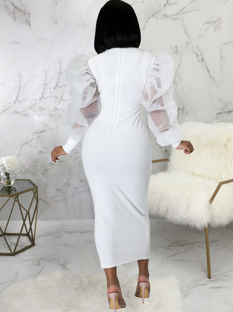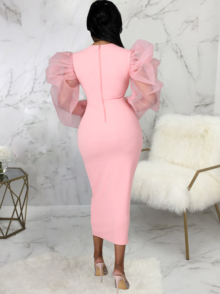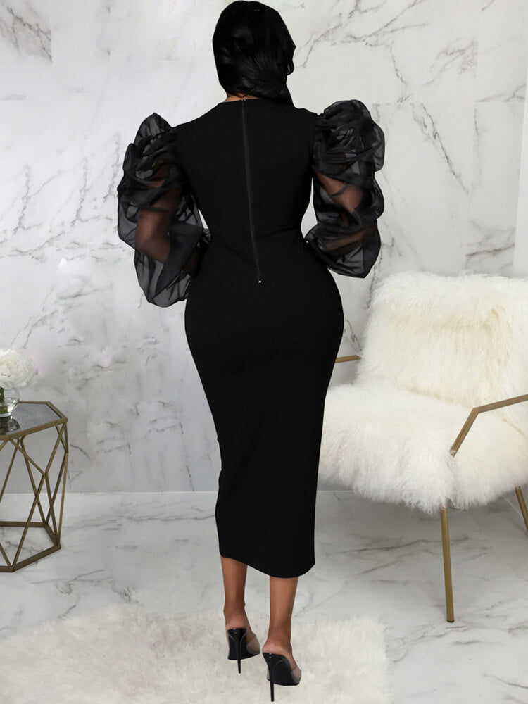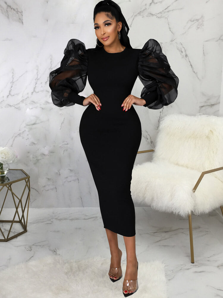 Feature: Mesh, patchwork, lantern sleeve, long sleeve, solid color, bodycon, midi dress.