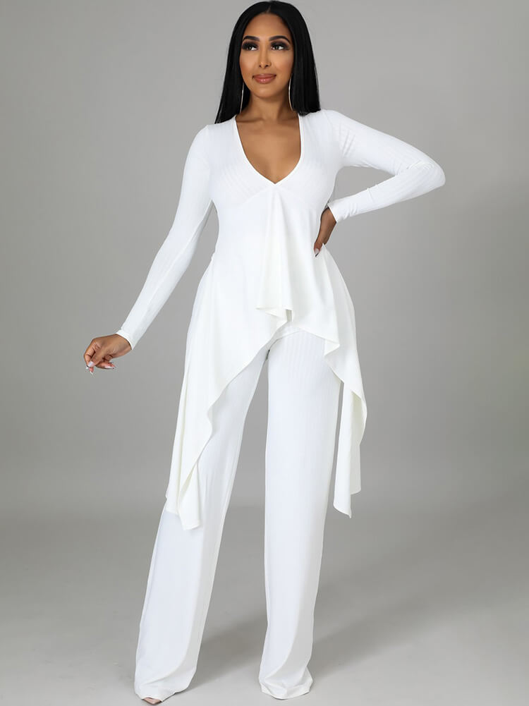 Features: Elastic waist, slim fit, two-piece outfits, long sleeve, v-neck, lace-up, asymmetrical, floor-length, loose, wide-leg, flare pants, solid color.