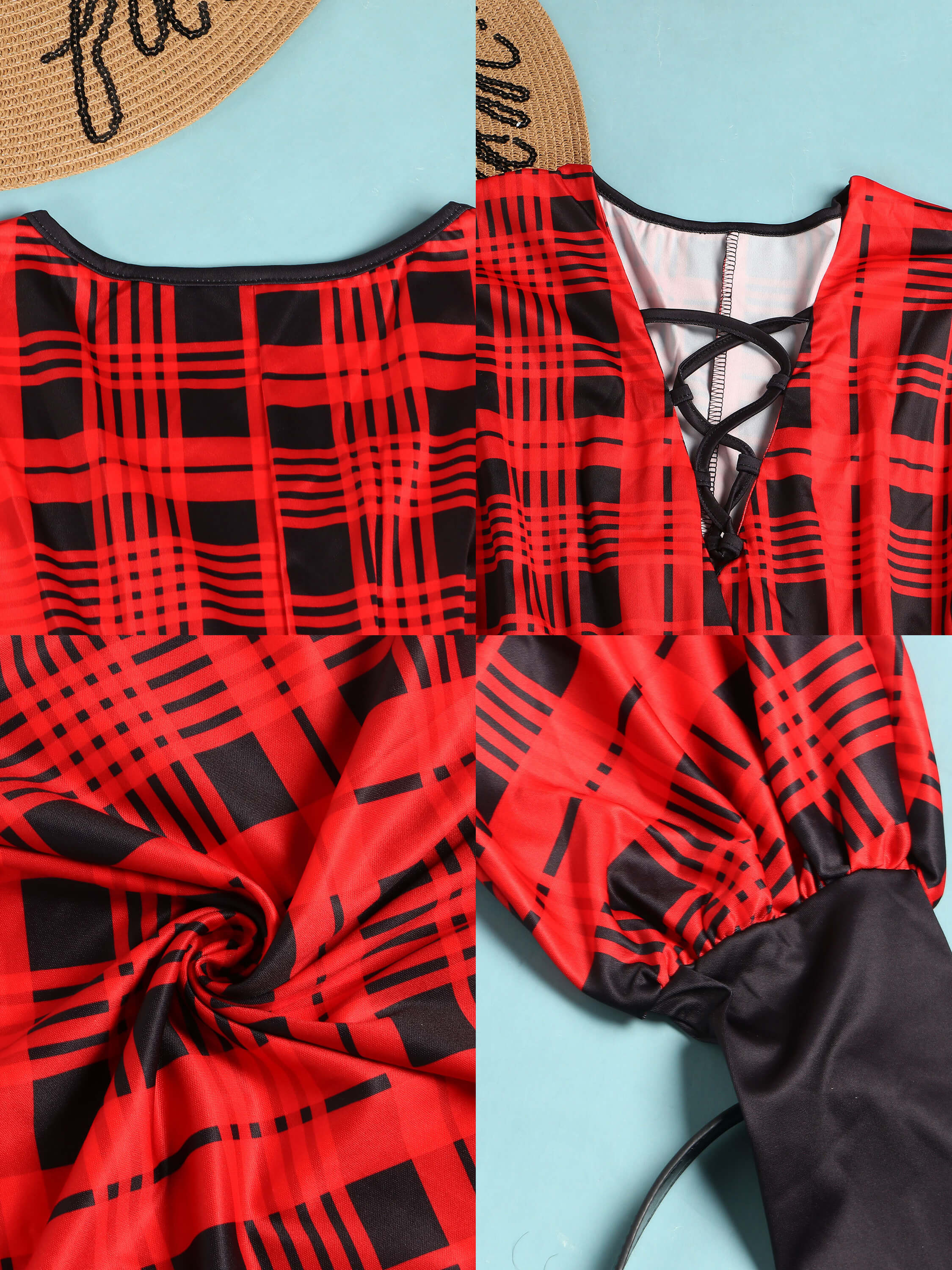 Feature: Lantern sleeve, criss-cross, long sleeve, plaid print, color block, bodycon, v-neck, midi dresses.