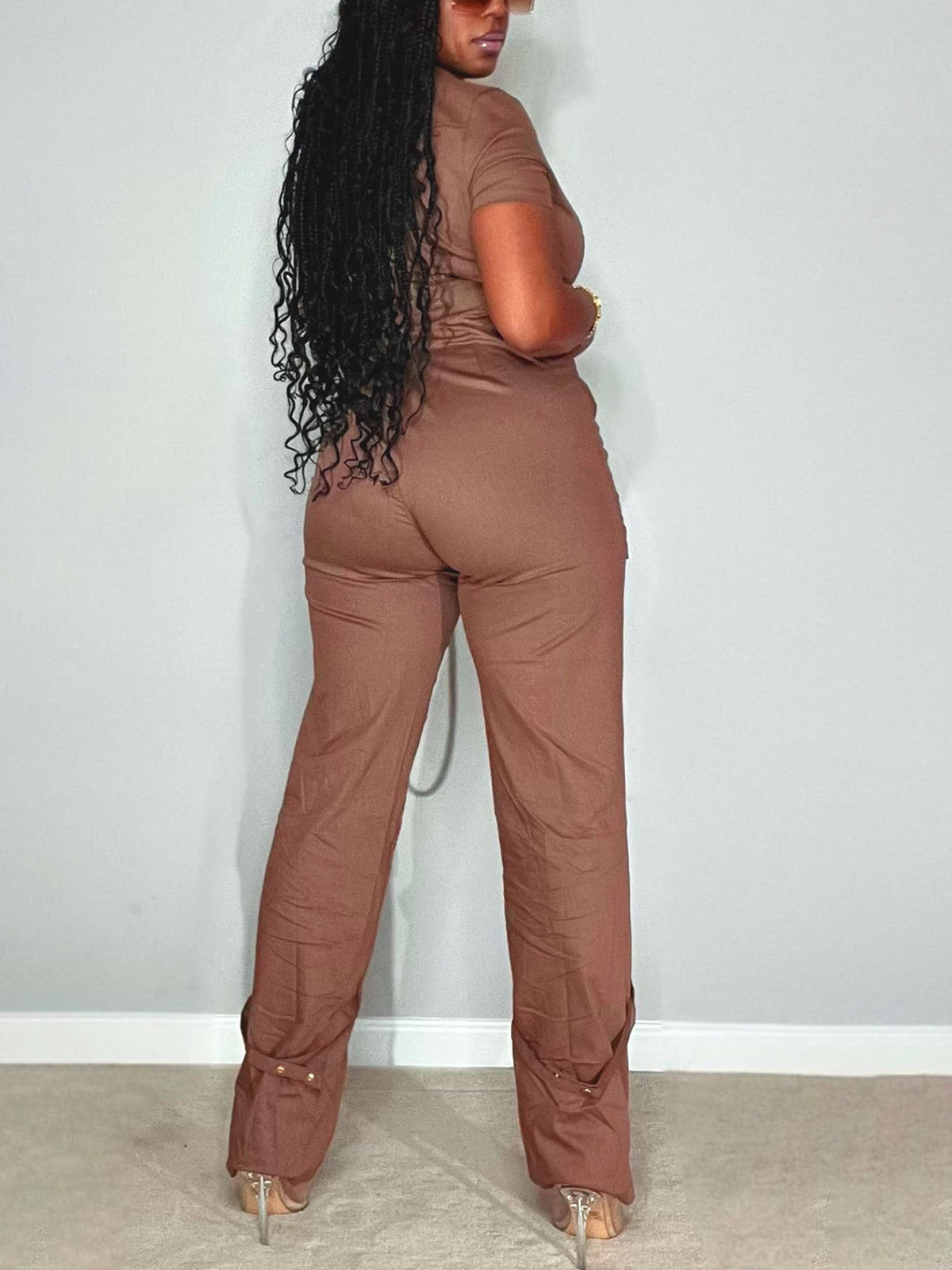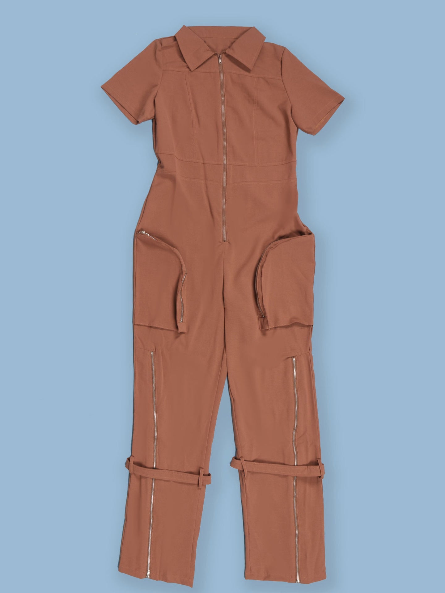 Short Sleeve Zipper Pocket Wide Leg Jumpsuit 750