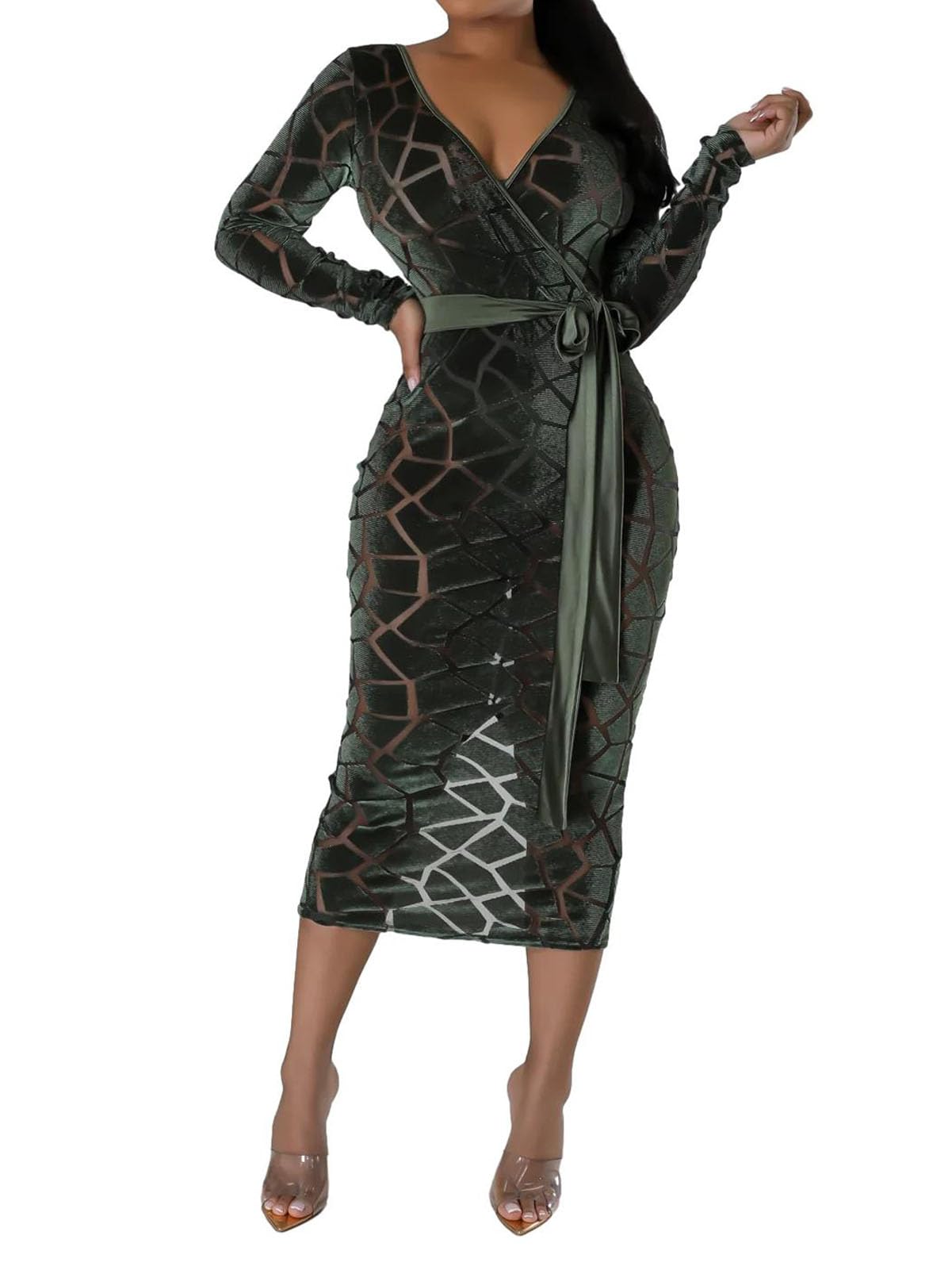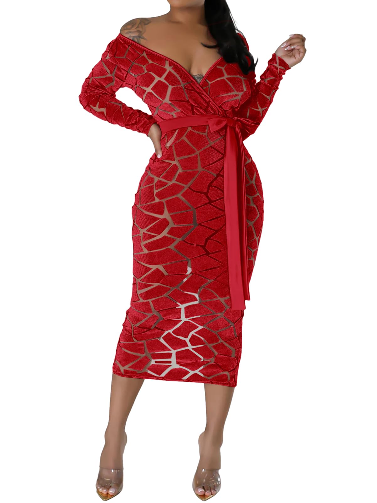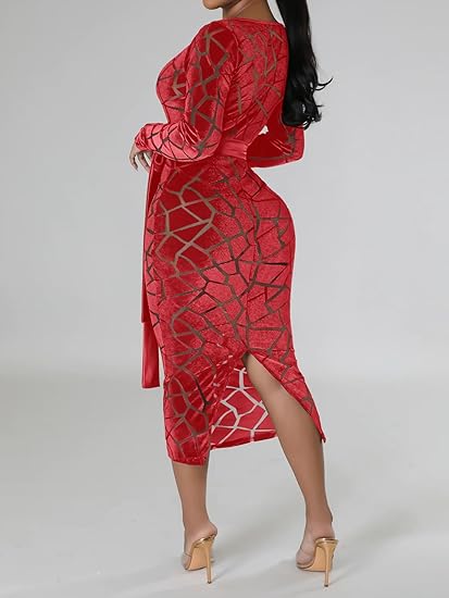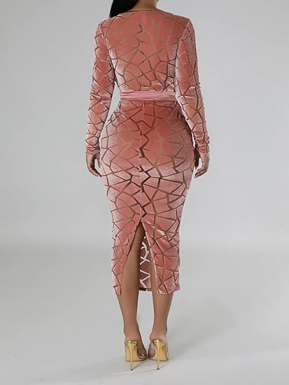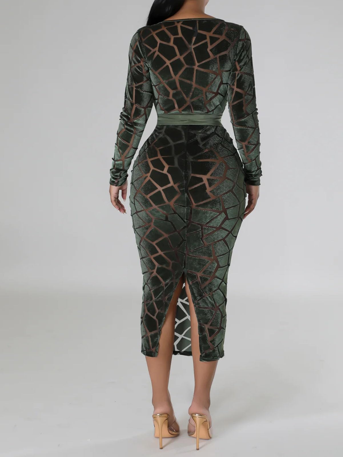 Its design features include a v-neckline, elegant mesh velvet patchwork, long sleeves, and a chic cutout with a striking split detail.