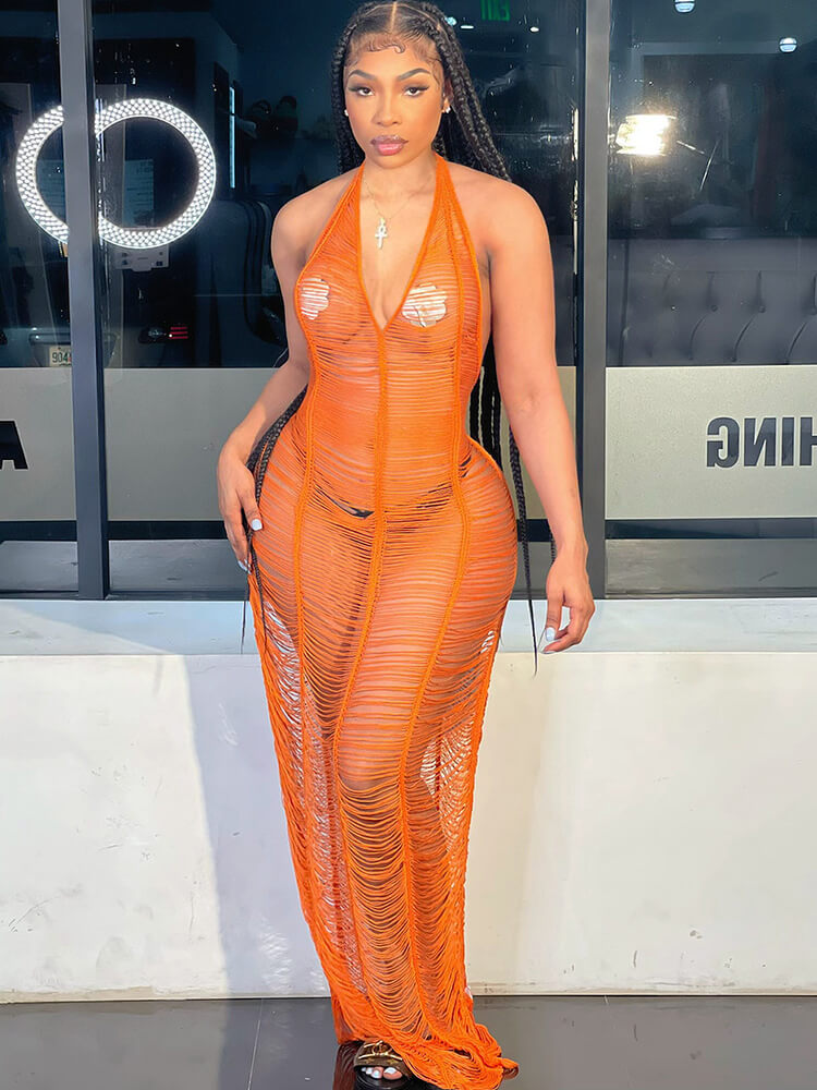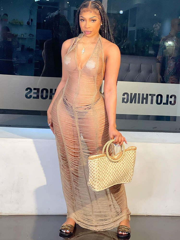 Feature: V neck, solid color, sleeveless, backless, see-through, hollow out, backless, maxi dress.