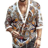 Material: Linen and Cotton.Features: Fashion printing shirts, short sleeves, soft and elastic, unique printing pattern design, simple style, lightweight, drawstring collar design, loose fit.Occasion: Vacation, beach wear, travel, etc.- $24.00