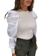 Material:90-95% Polyester. Features:Puff long sleeve, crew neck, patchwork, knit, tops.Style:Casual.- $18.00