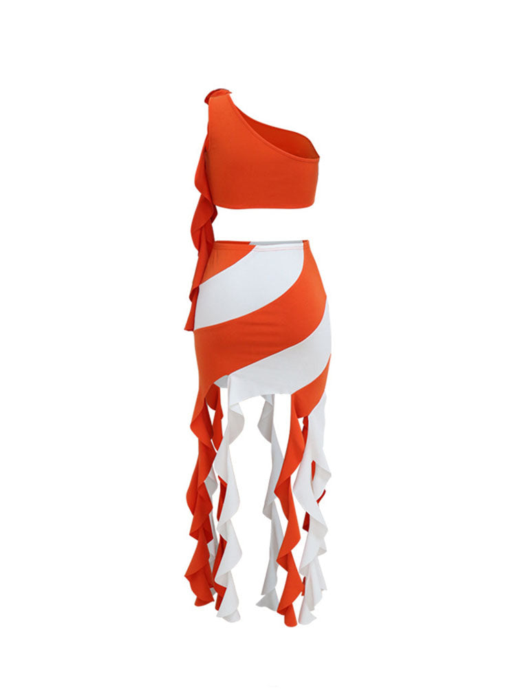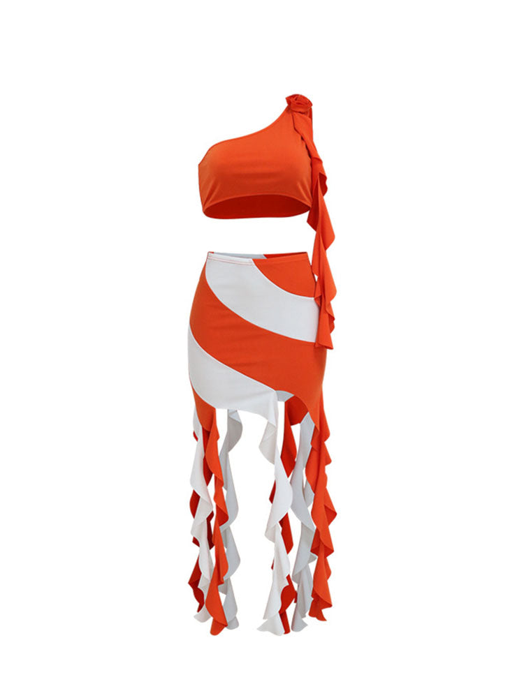 One Shoulder Crop Top with Fringed Mini Skirt Set