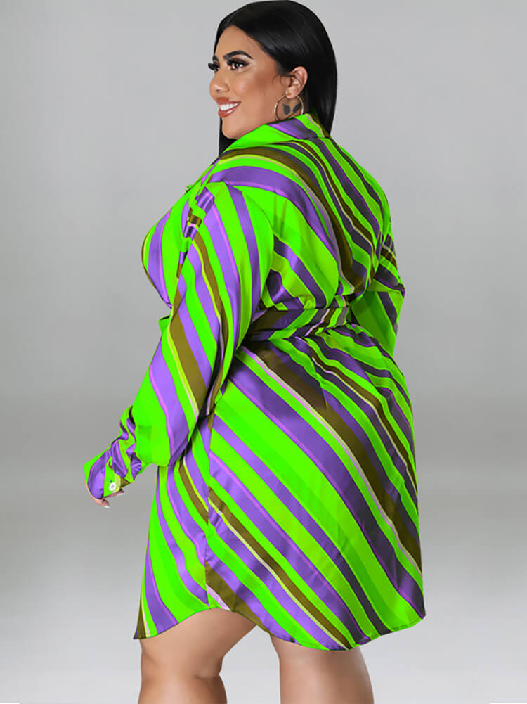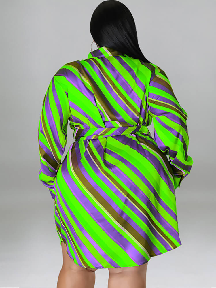Feature: Long Sleeve, striped print, v neck, lace up, button, bodycon, belt, mini dress.
