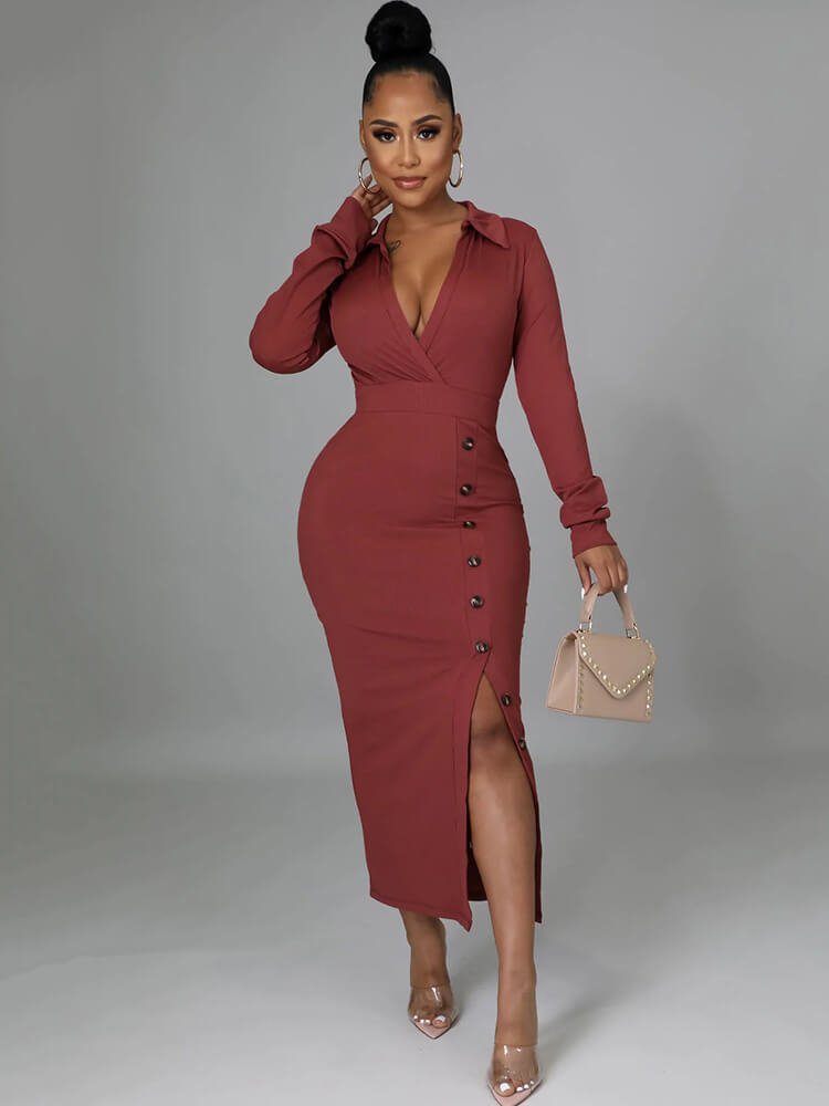 Feature: Long sleeve, solid color, button, bodycon, collar, v-neck, split, bodycon, midi dresses.